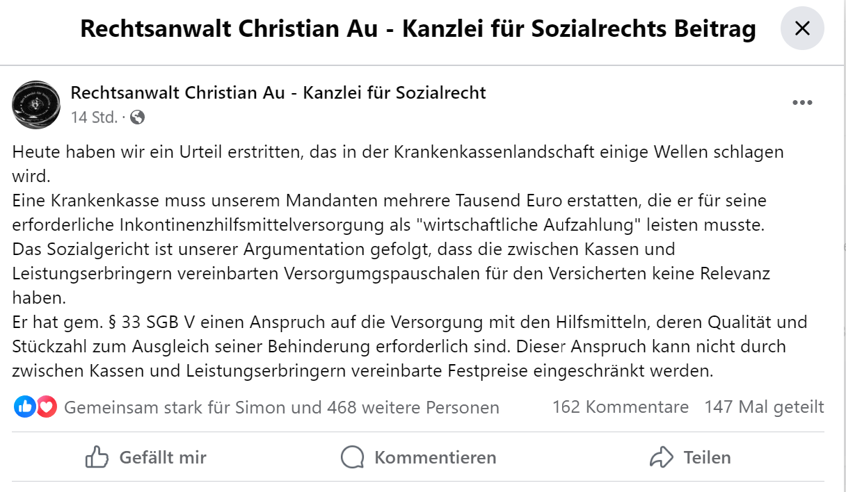 Ich habe heute erfahren das ein Anwalt die besseren Inkontinenzmittel als Krankenkassenleistung erstritten hat, wenn das Urteil Rechtskräftig ist, werde ich weiteres vermelden.
