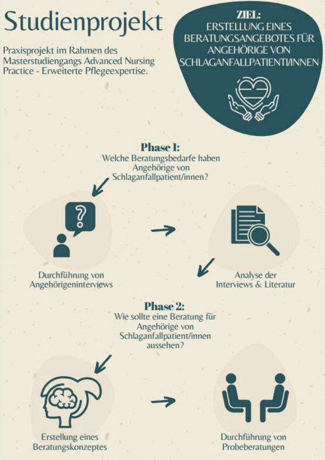 Ich führe derzeit Interviews zum Thema Beratungsbedarfe von Angehörigen von SchlaganfallpatientInnen in der Akutphase für meine Masterarbeit durch. Ich möchte nämlich im Rahmen meiner Masterarbeit ein Beratungskonzept erarbeiten, was in der Akutphase den Angehörigen helfen soll, sich auf die Entalssung vorzubereiten, sich auf mögliche Belastungen einzustellen und den Umgang mit diesen zu lernen. Mit der Akutphase meine ich speziell die Zeit nach der Stroke-Unit und vor Antritt der stationären Rehabilitationsphase; stationäre frührehabilitative Phasen zähle ich aber dazu.